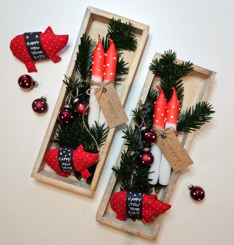 Danach überlegte ich mir, in welcher Form ich die Kerzen verschenken möchte. Kleine Holztabletts* hatte ich schon besorgt, die ich mit den Kerzen und Tannengrün bestücken wollte.